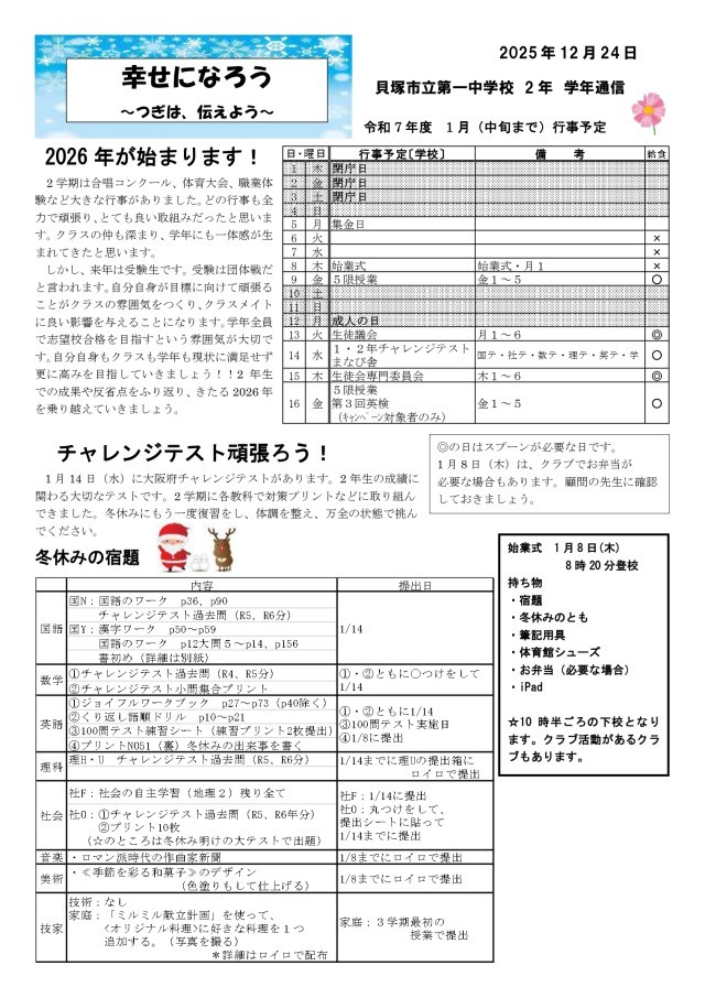 12月24日(水)、2年学年通信「幸せになろう」冬休み号を発行しました。右側の配布文書一覧にも載せています。