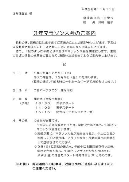 12月8日に行われる、3年マラソン大会の案内を配布しました。間違って、1・2年生の保護者様にも配布してしましました。
