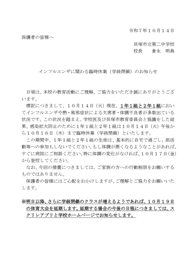 インフルエンザに関わる臨時休業(1年1組と2年1組 学級閉鎖)のお知らせ