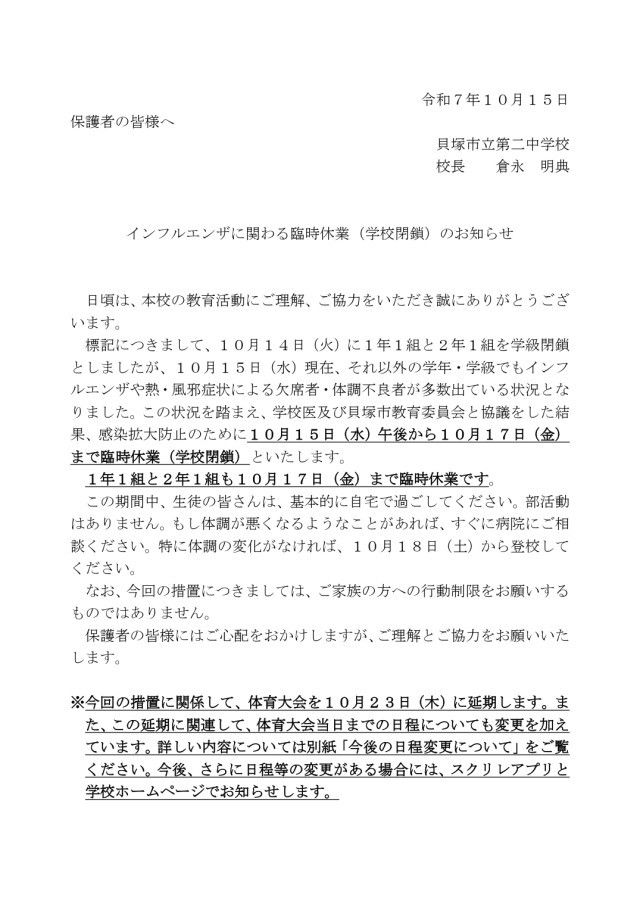 インフルエンザに関わる臨時休業(学校閉鎖)のお知らせ