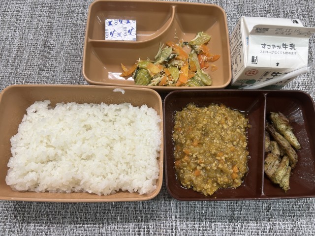 今日の給食は、牛乳、ごはん、ドライカレー、フライド長いも、チンゲン菜とささみの炒め物、ベビーチーズでした。