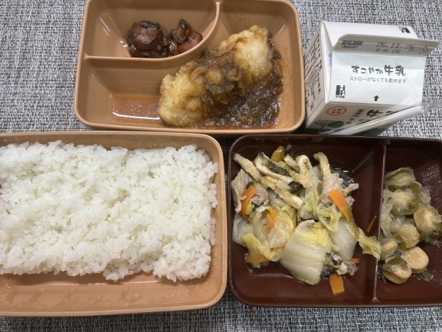 今日の給食は、牛乳、ごはん、白菜の煮物、ウインナーの炒め物、ホキのバーベキューソース、しば漬けでした。