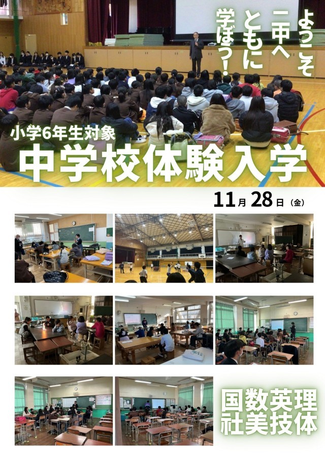 東小・津田小・中央小の三つの小学校が貝塚二中へ入学します。少しでも不安なく入学してほしいという願いから二中では体験授業を実施しています。今年は「国語・数学・理科・英語・社会・美術・技術・体育」を各教室で行いました。希望した教科に小学生が参加しました。そこでは楽しそうに授業を受けていて、不安も少し減ったように見えました。もちろん中学の勉強は難しくあきらめてしまいそうになりますが、「仲間とともに学ぶ楽しさが二中にはあります」仲間と助け合いながらどんな困難にも乗り越えられる力を身に付けてほしいと思います。