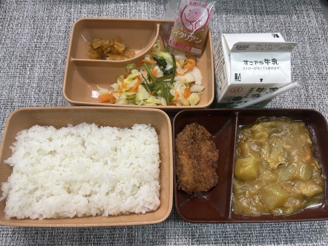 今日の給食は、牛乳、ごはん、冬野菜のカレーライス、ヒレカツ、茎わかめのサラダ、福神漬けでした。