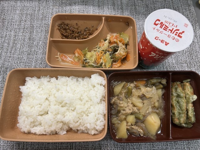 今日の給食は、アシドミルク、ごはん、肉じゃが、ちくわの磯辺揚げ、チンゲン菜とささみの炒め物、手作りかつおふりかけでした。