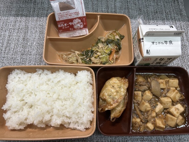 今日の給食は、牛乳、ごはん、麻婆豆腐、揚げぎょうざ、チンゲン菜のナムル、ミルメーク(ココア)でした。