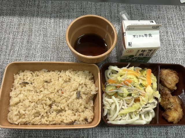 今日の給食は、牛乳、炊き込みご飯、ぶっかけうどん、とり天、かけつゆでした。