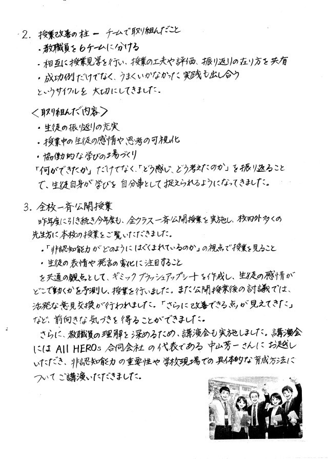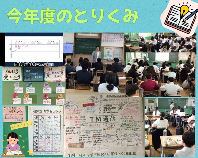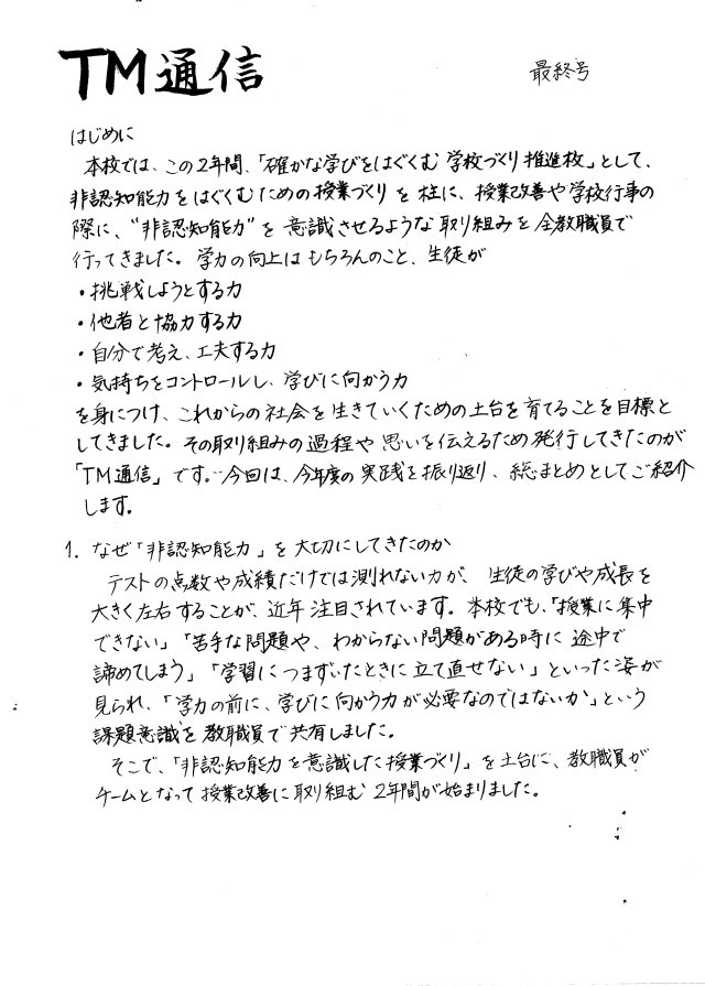 本校ではこの2年間、「確かな学びをはぐくむ学校づくり推進校」として、授業づくりや学校づくりの改善に取り組んできました。その取り組みの過程や成果をまとめたものが、今回掲載している「TM通信」です。本校では、学力の向上だけでなく、「挑戦する力」・「協力する力」・「工夫する力」・「気持ちをコントロールして学びに向かう力」などの「非認知能力」をはぐくむことを大切にしながら、日々の授業改善を進めてきました。教職員がチームで授業研究を行い、公開授業や研究会を通して実践を共有しながら、生徒の学びをよりよくする取り組みを続けています。