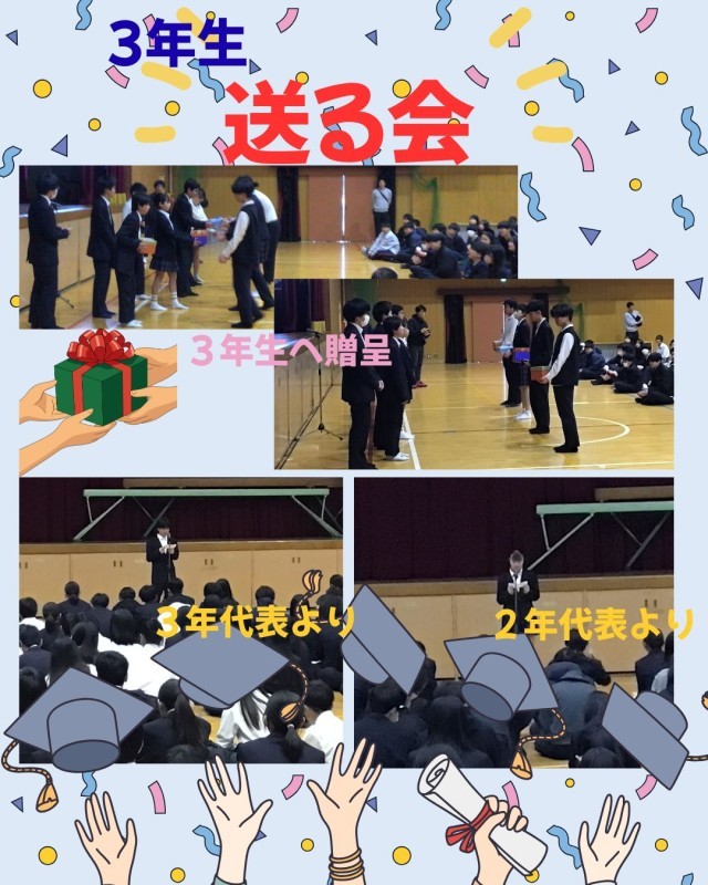 学級代表からは当日の証書をとめておくリボンを各クラスに贈呈しました。2年生からの送る言葉は3年生が後輩にやさしく丁寧に関わり続けてくれていたことへの感謝の気持ちと次は自分もそうなりたいという気持ちを語りました。そして3年生から自分たちの今までの頑張りを次の2年生へ受け継いでほしいという熱い思いを語り、集会を終えました。どちらも堂々と語り合えていました。2年生は最上級生としての心構えと準備をして過ごしてほしいです。3年生は残りの時間をしっかりと仲間と過ごし卒業式を迎えてほしいです。