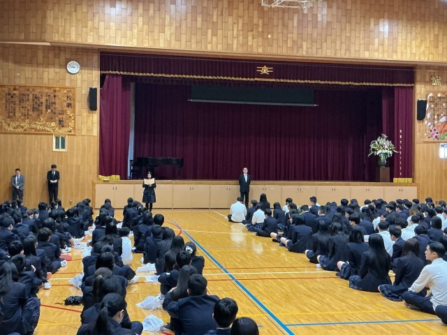 2、3年生の生徒のあたたかい拍手で、入場してきた新1年生の緊張も少しずつほぐれてきました。その後、生徒会執行部から歓迎の挨拶と新入生代表の決意の言葉で、お互いの新学期に対する期待する気持ちが溢れる対面式・始業式になりました。