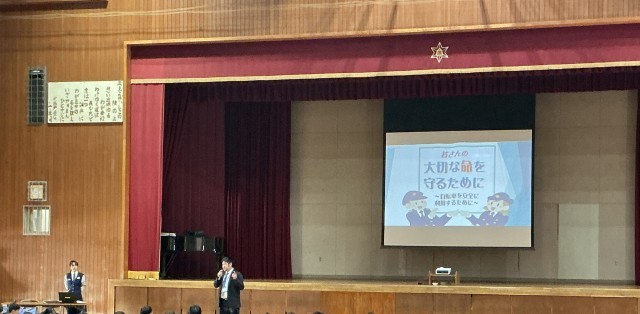 4月22日の全校集会で貝塚警察の方と市役所の方に来ていただきました。