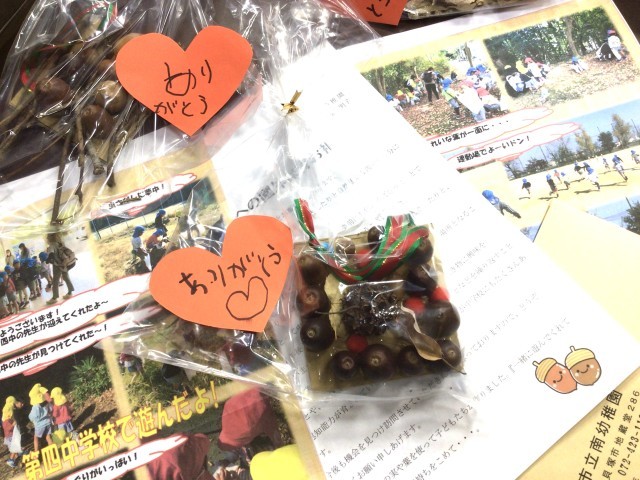 写真をご覧ください。先日、四中(の森)まで探検にやってきた南幼稚園の園児たちが、「いっしょに遊んでくれてありがとう😊」って、四中のどんぐりや木の枝で作ったオーナメントをプレゼントしてくれましたー!👏✨