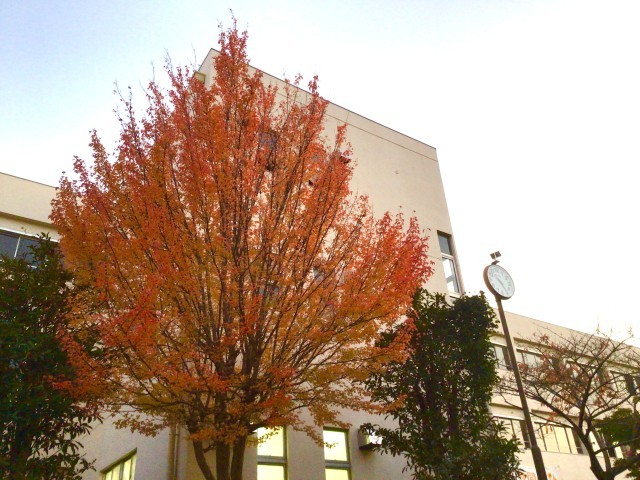 写真をご覧ください。まさに今、四中の紅葉は見頃を迎え、朝正門をくぐると真正面から、日にきらめく見事なグラデーションの落葉樹が生徒たちを迎えてくれます。(写真は日が陰った夕刻のものです😝💦バレないように少し加工しましたが正直者なので告白しておきます😆 ぜひ晴れた早朝に、きらめく本物を味わってください。)