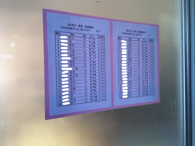1枚目→テスト週間も終わり、通常の学校に戻りました。写真は、持久走のタイム、トップ20の表です。現在、体育の授業では2000m走を行っており、各学年のフロアに掲示されています。みんな1回目のタイムは様子見なのかペースが遅いですが、本日2回目を終え、学年フロアに戻ってくると、ほっぺを真っ赤にした子たちが『●秒縮まった!』『●十秒縮まった!』と報告に来てくれました(^^♪中には『3分縮めてきたで!』と≪どや!≫と言わんばかりの表情で寄ってきてくれる子もいました😊みんな頑張っててイイ感じやぞ~👍