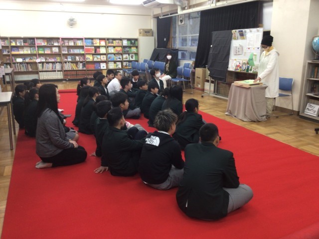 赤い絨毯に座って、読み聞かせボランティアの方の「物語の世界」にひたります。