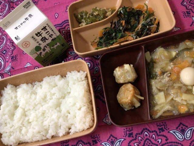今日の給食は、中華うま煮、揚げしゅうまい、磯香和え(いそかあえ)、無限ピーマンでした😊