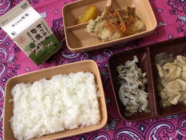今日の給食→豚肉のしょうが炒め、れんこんマヨ炒め、あじの南蛮漬け、大学いもでした🍠