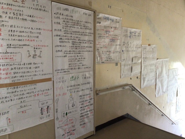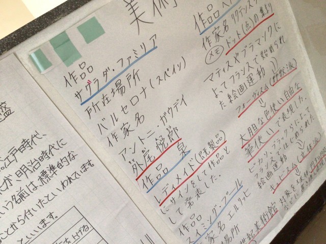 2,3枚目→3年生フロアに掲示されている学年末テストの壁新聞。通称『テスト対策壁新聞』です。3枚目の美術をよ~く見ると、教科担当の先生から朱書きで訂正が入っていました😳😳スペインのバルセロナにある歴史的建造物の名称は【×サクラダ・ファミリア】ではなく、【〇サグラダ・ファミリア】ですよ~🙄