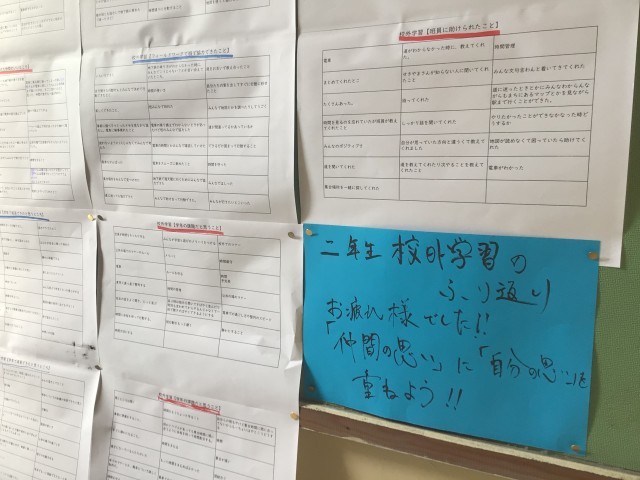 中央階段を上っていると、踊り場に、先日の、2年生校外学習の振り返りが掲示されていました。「成長できたこと」「課題だと思うこと」「助けられたこと」「協力できたこと」など、色々な観点で自分たちを見つめ直しています。