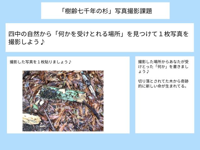 2年生の道徳に『樹齢七千年の杉』というお話があります🌳。授業のなかで、四中にもたくさんの自然がある。教室から飛び出して、四中の自然のすごい所を撮影してこよう📸!という課題が昨日ありました(写真2,3枚目)。そして本日、私が敷地内のゴミ拾いをして歩いていており、ぱっと視線をあげるとそこには神秘的な光景が(写真1枚目)⭐地面手前には緑の葉っぱ🍃奥にはピンクの花びら🌺この二つの境目にちょうど建物の陰が重なり、綺麗な花びらが日差しに照らされ、より一層鮮やかに見えました✨四中の大自然、良いところですよ~😉