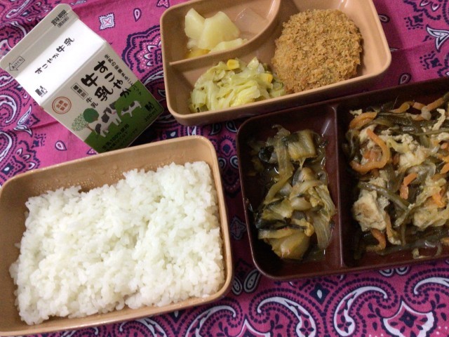4枚目→今日の給食:茎わかめの炒め煮、キムチとニラの炒め物、カレーコロッケ、キャベツとコーンのソテー、フルーツミックスでした😋ご馳走様でした🙏