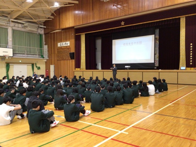 16日㈪、3年生が卒業し1,2年生のみで全校集会が行われました。