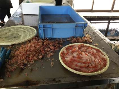 体験の様子です。今年度から水産加工のご家庭にもお世話になっています。甘エビの殻剥き、ホタテの殻外し、ホッケの頭を落とす…といった作業でした。甘エビを綺麗に並べたものは生徒作品です!