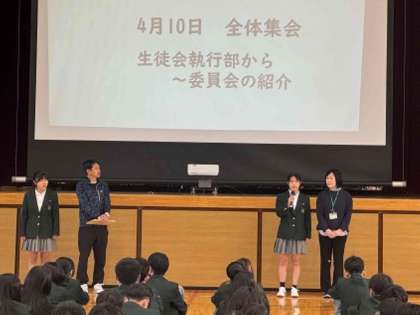 それに先立って、1時間目は集会を行い、1年生のために、前年度の委員さんや顧問の先生から、それぞれの委員会の活動について、説明がありました。