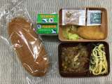 牛肉のデミグラスソース煮、ほうれん草のスパゲティ、あじフライ、コッペパン、りんご...