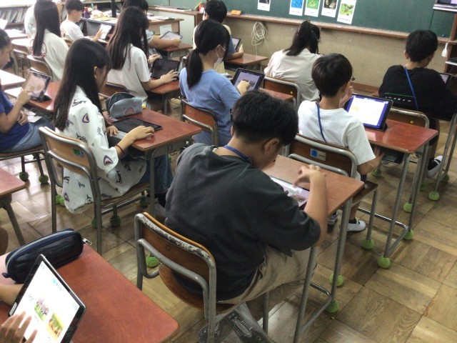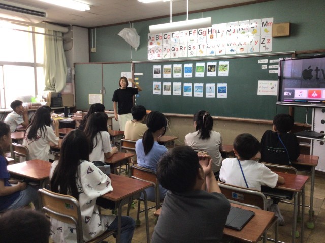 外国語の授業では(eat)をキーワードにして、動物カードを使いながら学習しました。