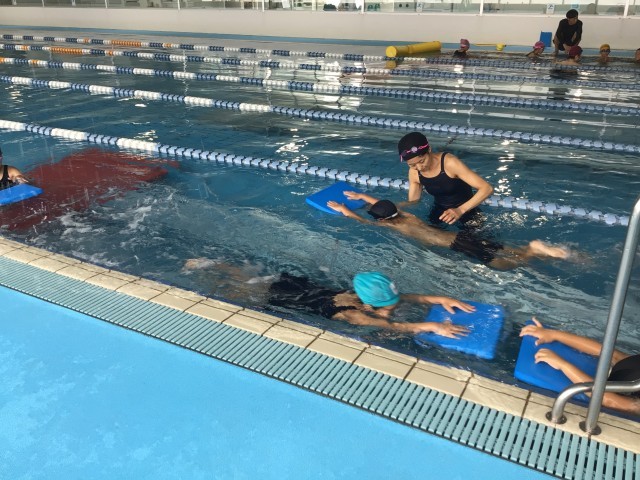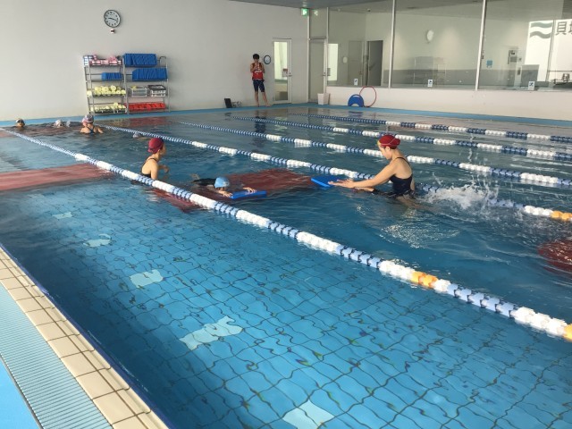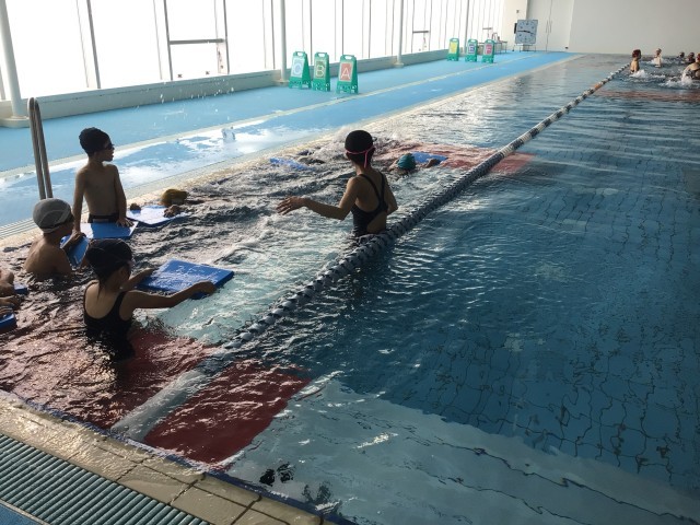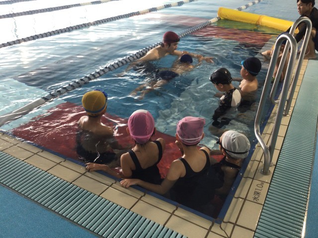 2年生、2回目の水泳です。アニメーターの話をしっかり聞いています。楽しく泳いでいます。