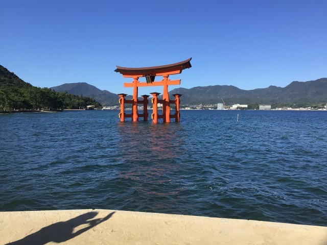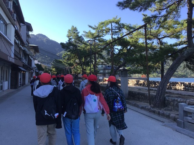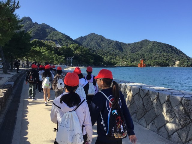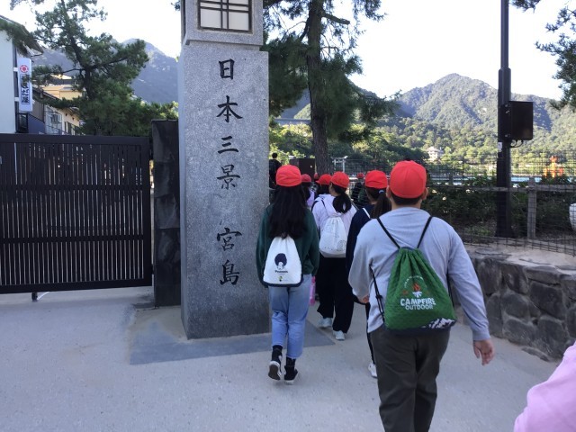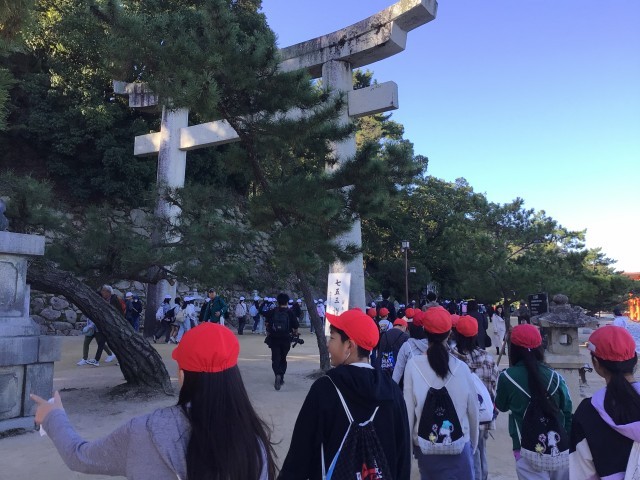 宮島に着きました。厳島神社に向かって歩きます。厳島神社をバックにクラス写真を撮ります。