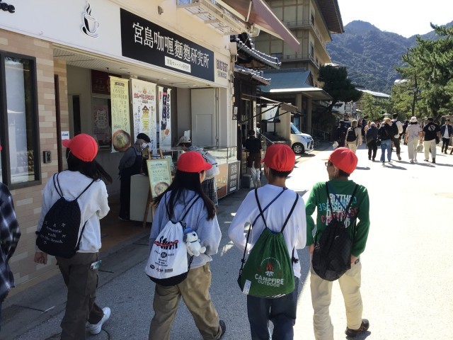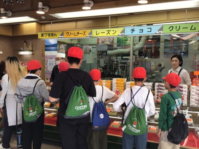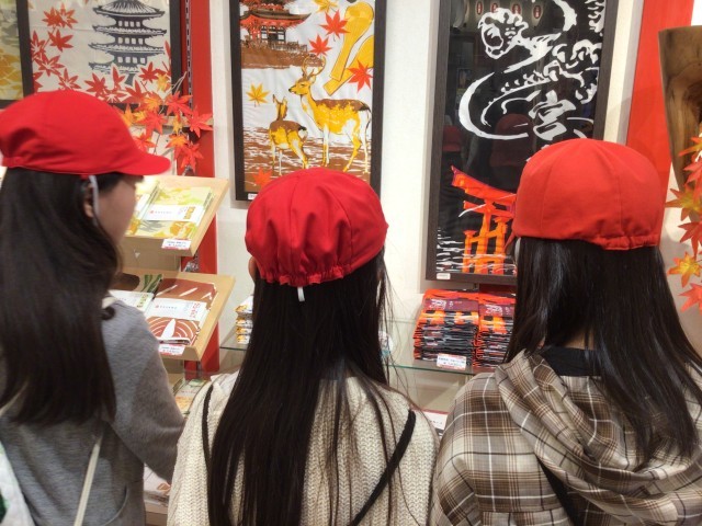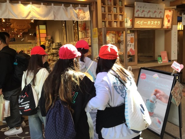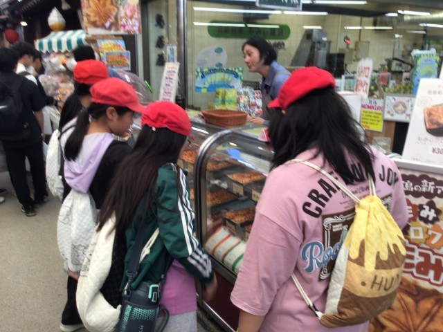 昼食を済ませて、商店街を散策しました。班でお土産を買ったり、食べ歩きをしたりしながらおこづかいを大切につかいました。