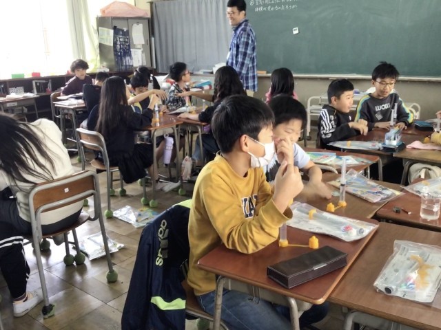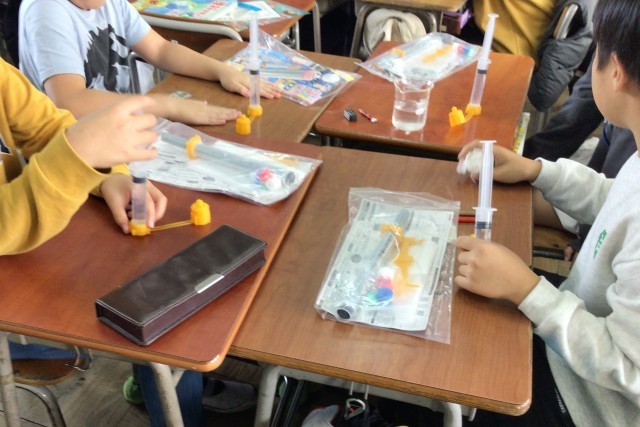 4年生は、理科の学習で注射器を使って、閉じ込めた空気がどうなるのかの実験をしていました。空気の力を実感して驚きの声があがっていました。