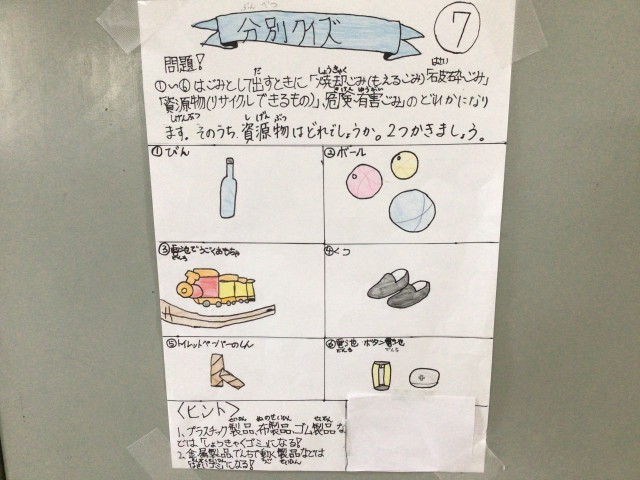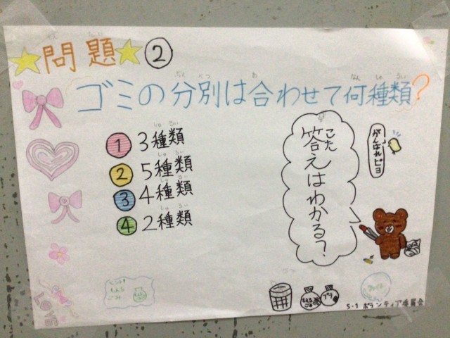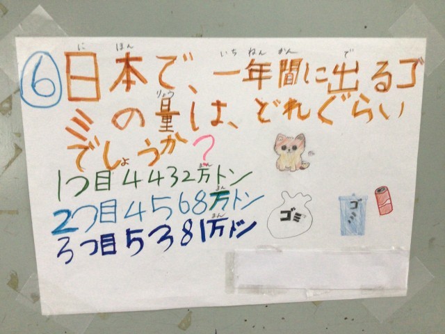 ボランティア委員会の子どもたちが、ごみの減量や分別の意識を高めるために、クイズをポスターにして掲示してくれています。よく練られた問題で、立ち止まって考えている子どもたちもいます。