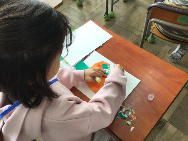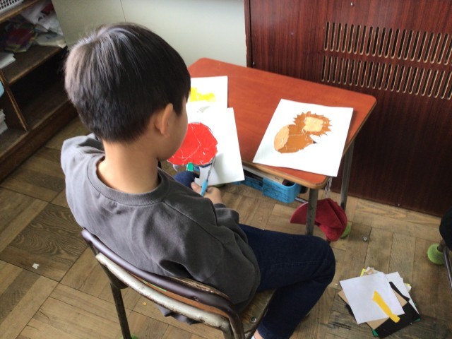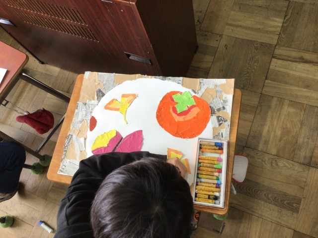 2年生は図工で秋の味覚をちぎり絵であらわしていました。折り紙を手でちぎって黙々とはっていました。