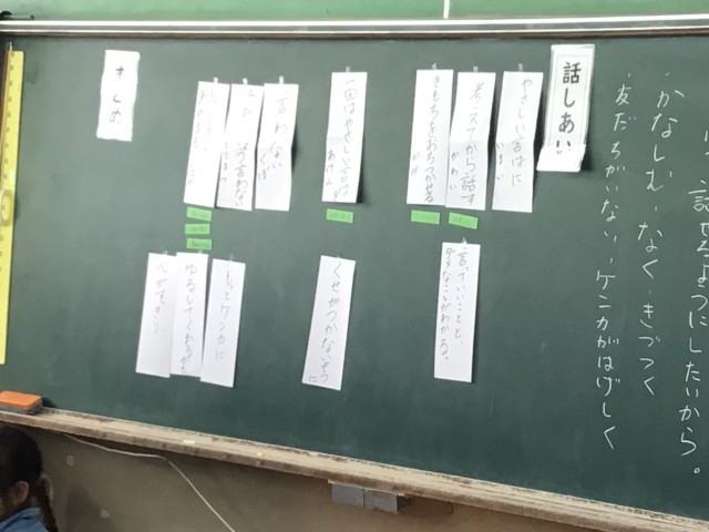 2年生では、5時間目に人権教育の公開授業研修をおこないました。クラス内での言葉づかいを議題にして、学級会をおこなう様子を、全教職員が参観しました。友だちの意見を大切にしながら、子どもたちは自分の考えを発表し、上手に話し合うことができていました。