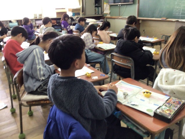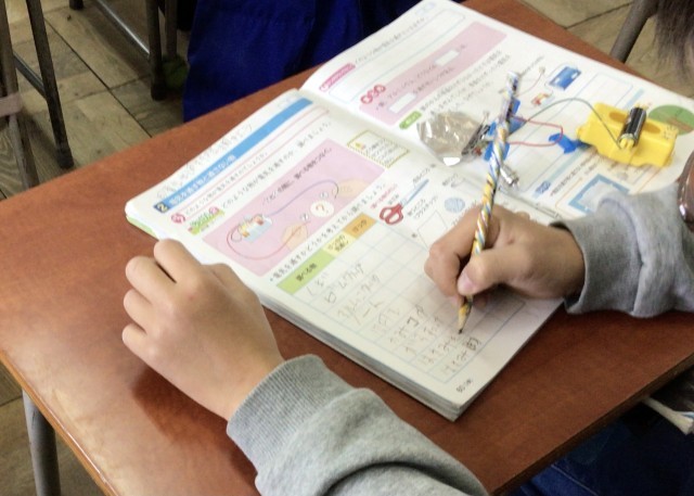 3年生では理科の学習で、電池の回路を作って電気を通すものと通さないものを調べる実験をしていました。今年度の全国学力調査の理科でも出題されていました。
