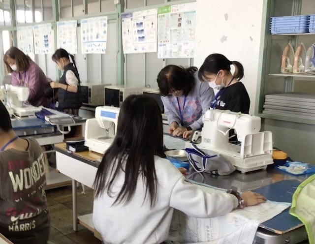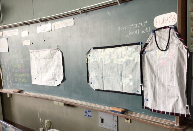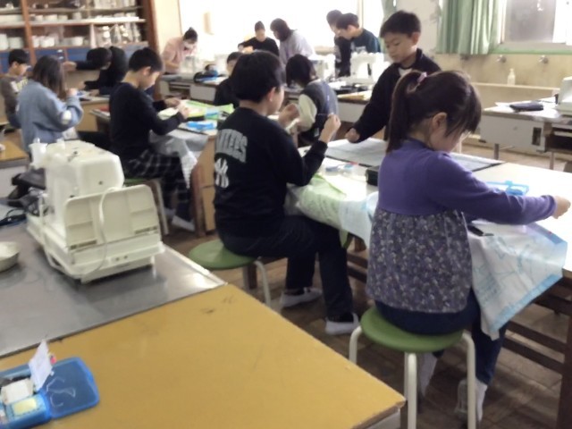 5年生は、3学期にエプロンづくりにとりくんでいます。今日はまち針を使ってしつけをしていました。