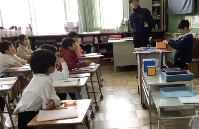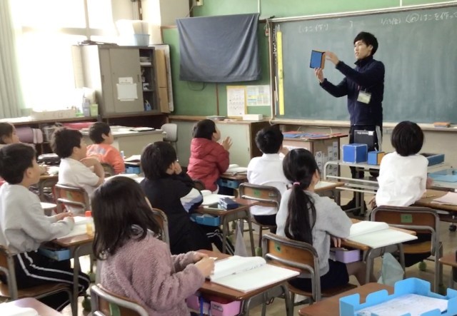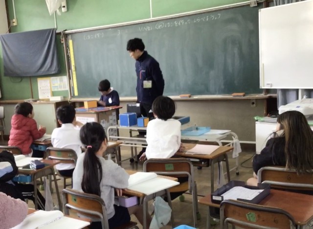 2年生は算数の時間、「はこのかたち」の学習をしていました。1枚の板がいくつか組み合わさって箱ができることを、みんなで確かめていました。
