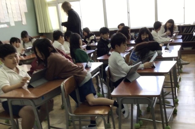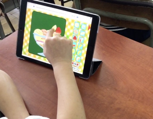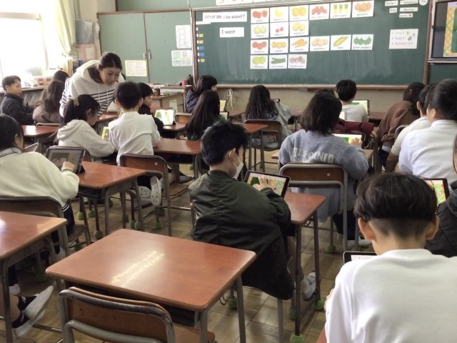 4年生は、タブレットを使いながら、友だちと「好きな食べ物は何か」を英語を使って尋ねる学習をしていました。iPadの画面のイラストを使いながら楽しくコミュニケーションをとっていました。