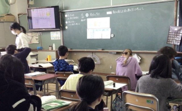 5年生では、算数で立体の学習をしていました。角柱の立体図を見て推測しながら、頂点や面の数を確認していました。