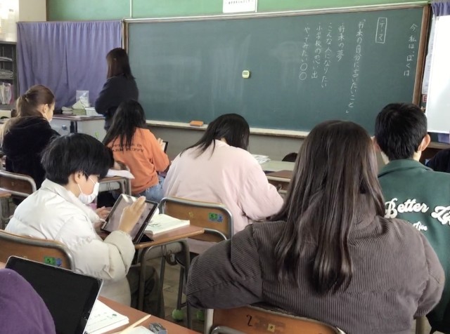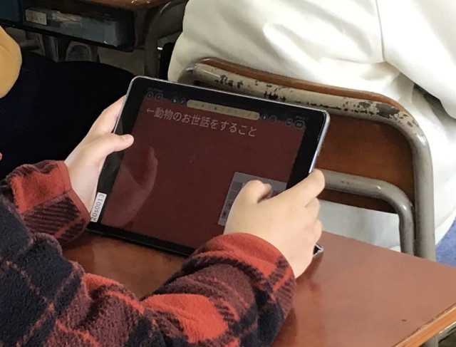 6年生は国語の時間に「今、私は、ぼくは」というテーマでスピーチをする学習をしていました。将来の夢や未来の自分に言いたいことなどを、タブレットを使ってスピーチの原稿を考え作成していました。