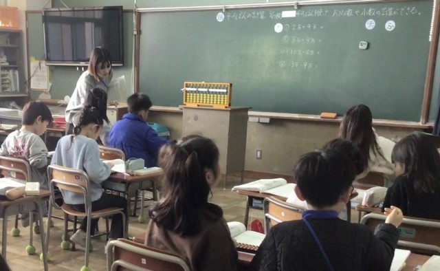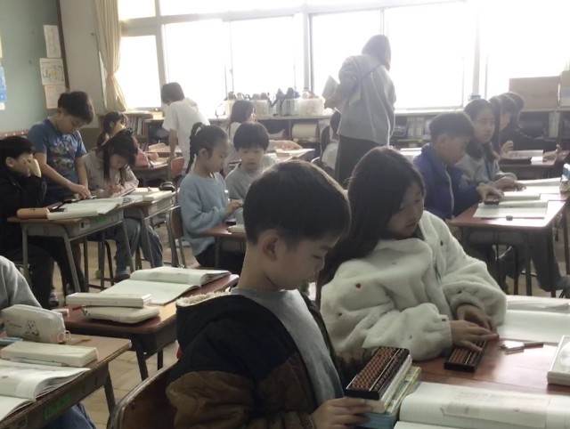 3年生では、算数の時間にそろばんを使って計算問題にとりくんでいました。10万の位もある大きな数でしたが、となり同士ペアになって各自のそろばんを使い、正解を導き出していました。