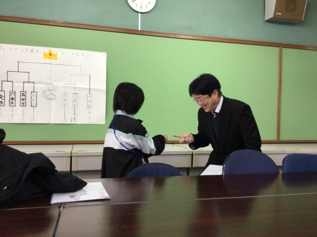 4日(水)zoom集会がありました。企画集会委員会のじゃんけん王決定戦が行われました。各学年の代表と先生代表がトーナメント方式でじゃんけんをしました。最後は、校長先生と勝負をし、見事2年生代表がチャンピョンになりました。とても盛り上がりました。