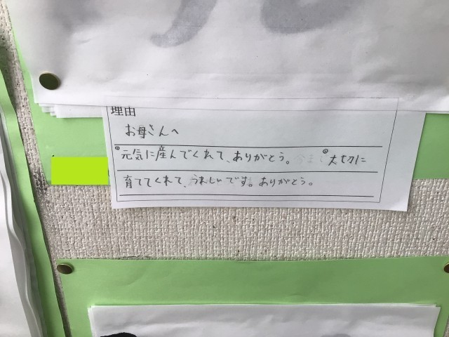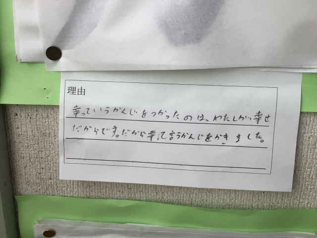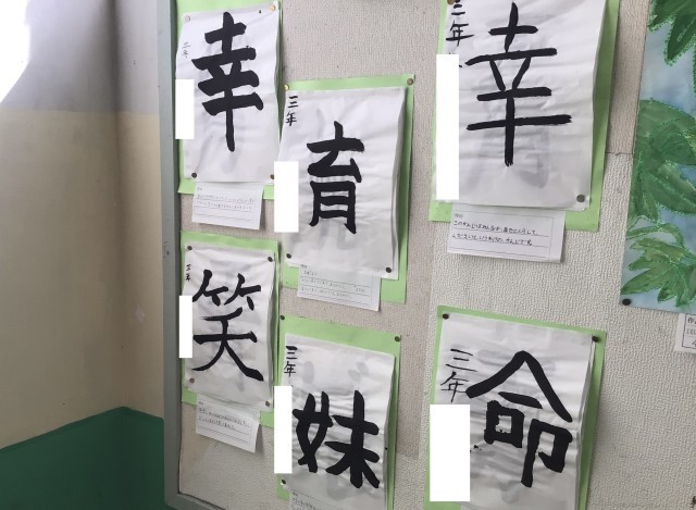 3年生では、漢字1文字を毛筆で書いて、その漢字を選んだ理由を添えた作品が掲示されています。理由のところには、一人ひとりの想いが詰まった文章が書かれていて、心がほっこりしました。