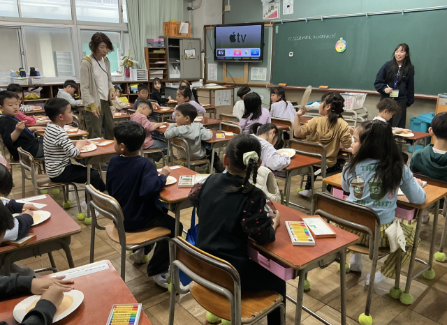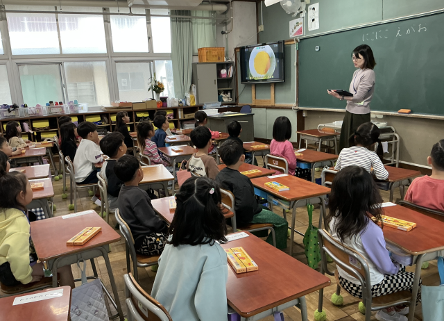 1年生では、図工の時間に「にこにこ えがお」というテーマで、自分の似顔絵を描いていました。クレパスを使って、いっしょうけんめいとりくんでいました。