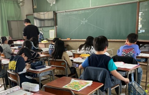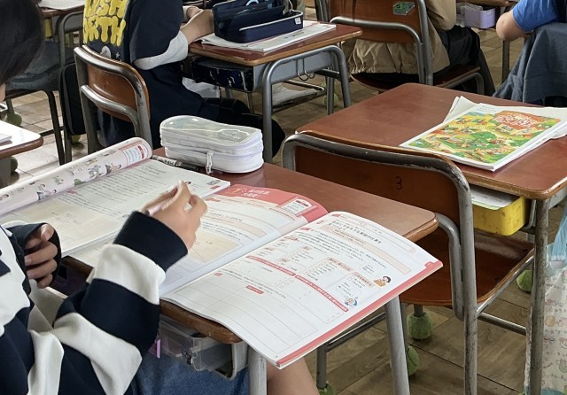 5年生では家庭科の学習が始まりました。新しい教科書とワークシートを使って、生活を支える「衣食住」について考えていました。