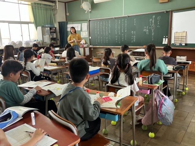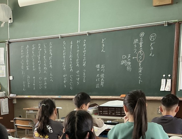 3年生の国語の学習では、学年のスタートの教材として、谷川俊太郎さんの詩を学習していました。先生の範読を聞いて、言葉の調子を楽しみながら詩の世界を感じ取っていました。