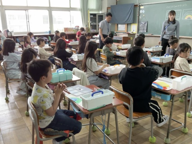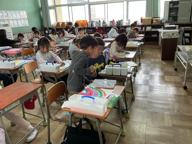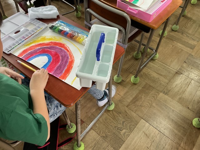 2年生では、絵の具を使って「虹」の絵をかいていました。上手に絵の具をパレットに出して、丁寧に筆を使ってぬることができていました。